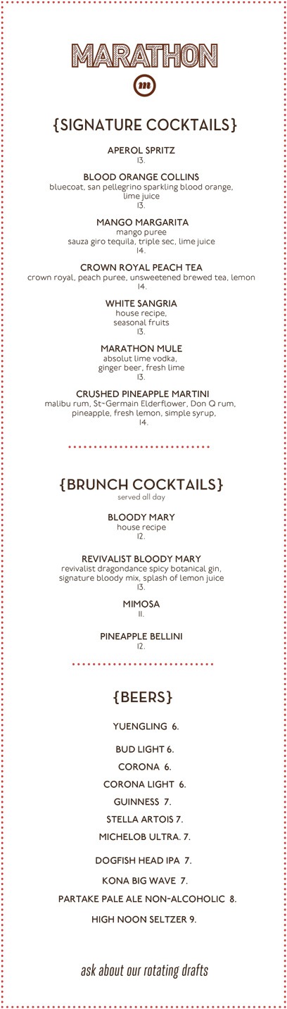 As a family owned and operated restaurant, we take pride in the comfort food that we serve. We are a restaurant model crafted upon a philosophy our management team takes pride in — a philosophy founded upon warm and personable hospitality, while at the same time, introducing guests to our city’s local purveyors. Marathon Grill opened 38 years ago to serve the neighborhood, not only as a place to dine and drink, but also to offer the farm-fresh lifestyle.